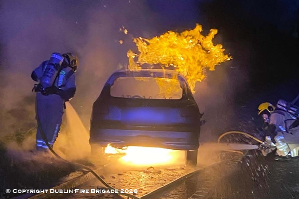 Fire crews from Balbriggan and Skerries stations seen dealing with a car fire on the M1 Motorway (Southbound) at junction 6 Balbriggan on Friday 27th March. ~Dublin Fire Brigade