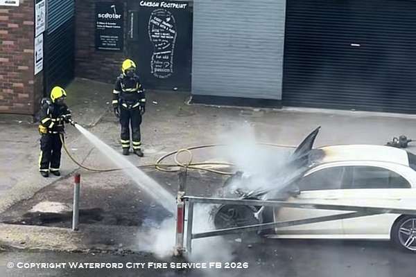 Waterford City Fire Station Red Watch responded to a car fire in Waterford City Centre Oon Saturday 14th March. Quick thinking by the driver saved a lot of traffic disruption as he pulled the car off the road into an empty parking area. Crews did have to close the road for a while as the smoke and steam from the fire caused bad visibility for drivers. ~Waterford Fire Service FB