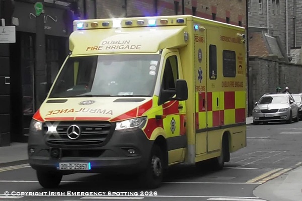 Dublin Fire Brigade Ambulance "Reserve Ambulance 3" seen mobile to an EMS case towards Townsend Street in March '26.