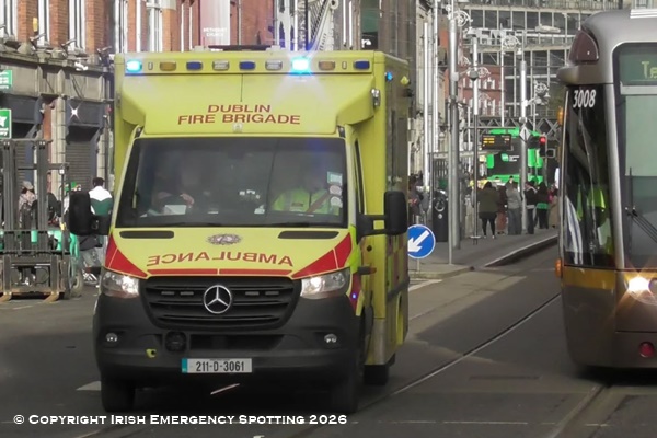 Dublin Fire Brigade Tara Street Station Ambulance "DN21 Delta 1" seen mobile to an EMS case towards on Abbey Street in March '26.