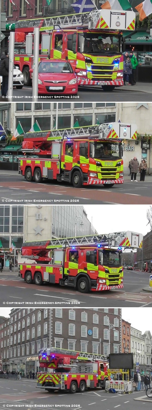 Dublin Fire Brigade Tara Street station Turntable Ladder "DN21 Foxtrot 1" seen mobile to incident onto Aston Quay on Saturday 11th March.